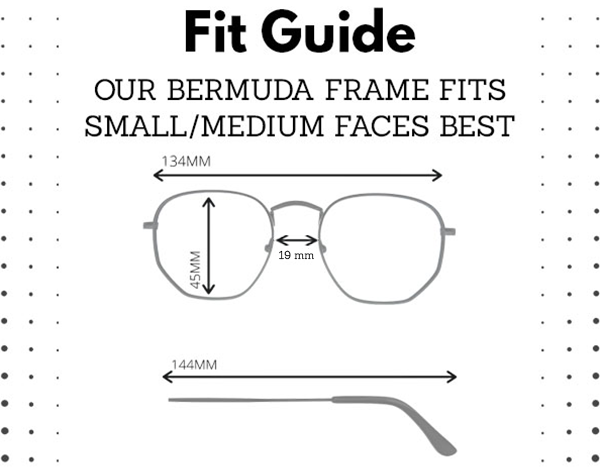 Our Bermuda frame fits small/medium faces best. Frame measurements: 134MM width, 45MM lens height, 19MM bridge, 144MM temple length.