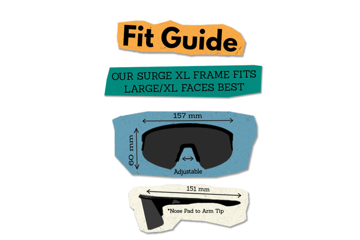 Fit Guide: Our Surge XL frame fits Large/XL faces best. Measurements shown: 157 mm (frame width), 60 mm (lens height), 151 mm (nose pad to arm tip). Nose area is adjustable.