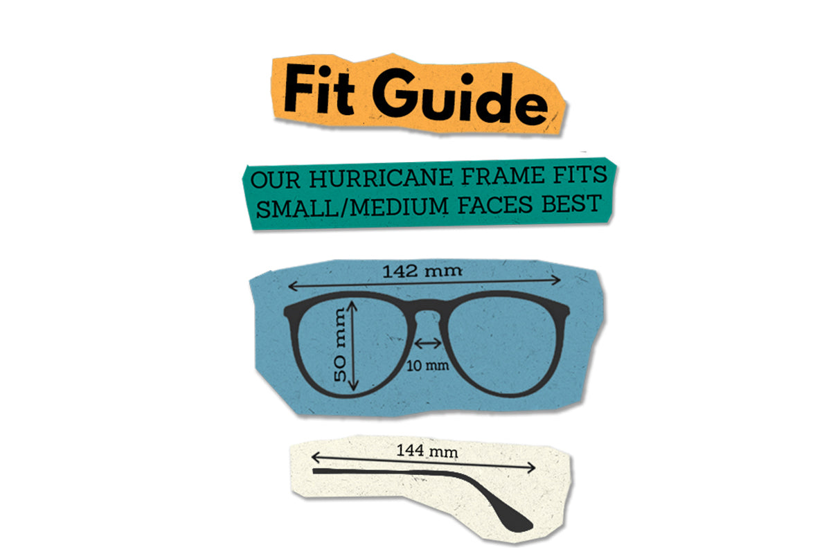 Fit Guide: Our Hurricane frame fits most small/medium faces best. Frame measurements 142mm (front width), 50mm (lens height), 10mm (bridge), 144mm (temple length).