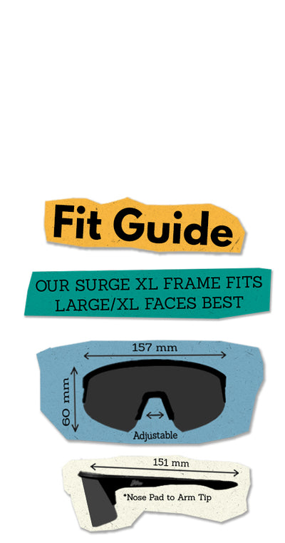 Big frame for the big dogs! Surge XL typically fits like a glove for those who have trouble finding a pair of shades that doesn't look too small on their head.